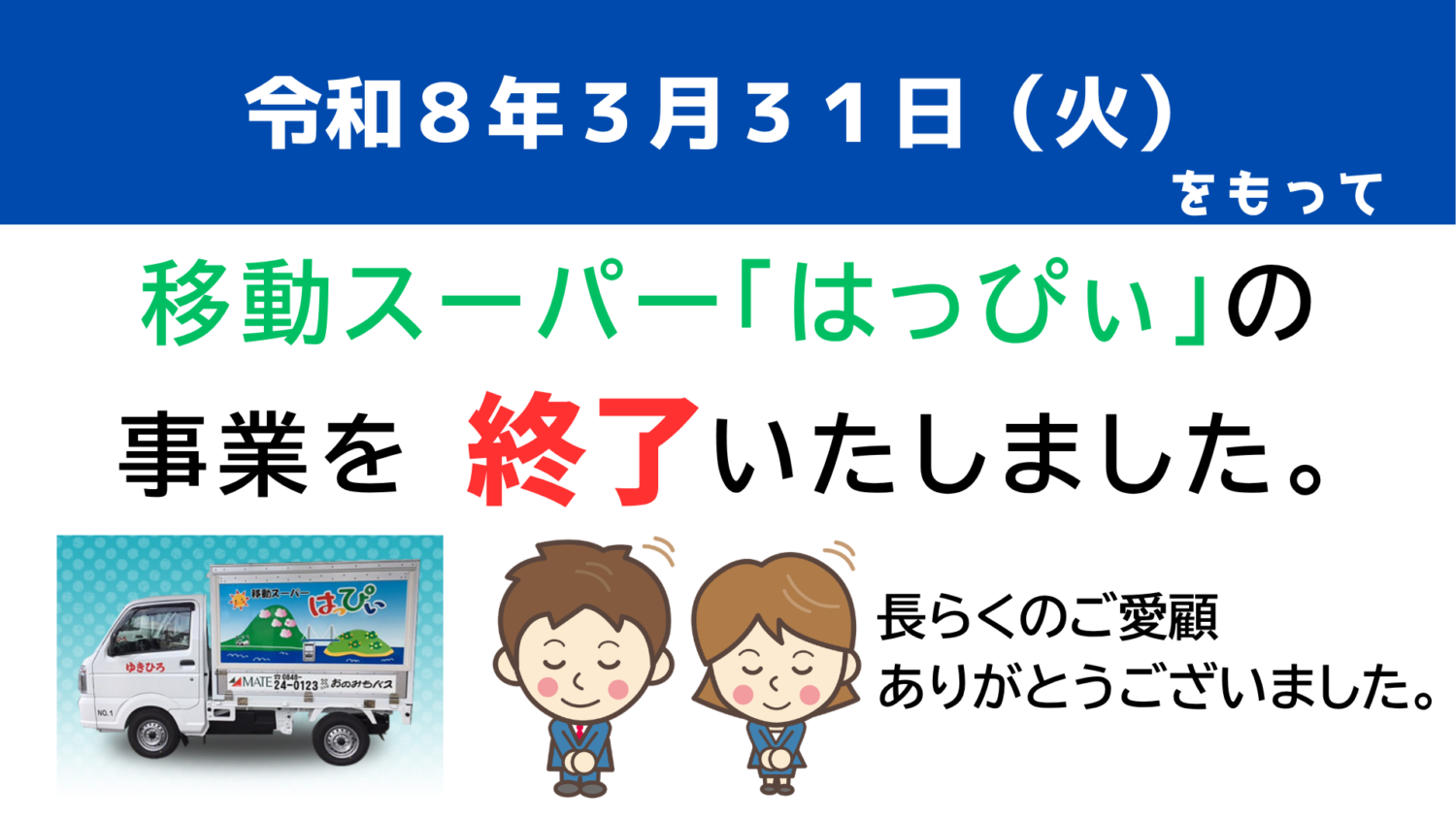 平成29年より9年間にわたり移動スーパー事業を継続してまいりましたが、諸般の事情により、令和8年3月31日をもちまして、本事業を終了させていただくこととなりました。